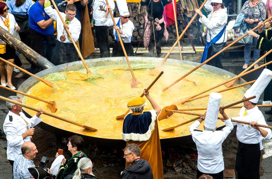 Zatímco tak v patnácti zemích Evropské unie (mimo Česko) musejí obchodní řetězce stahovat z pultů vejce kontaminovaná insekticidem fipronilem, rytíři jmenovaného bratrství jsou si prý jisti, že jejich omeleta je zcela nezávadná. Letos na její přípravu padlo deset tisíc vajec a smažila se ve čtyřmetrové pánvi na otevřeném ohni. Poté ji kuchaři naporcovali a rozdali přihlížejícím.