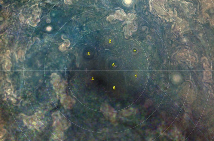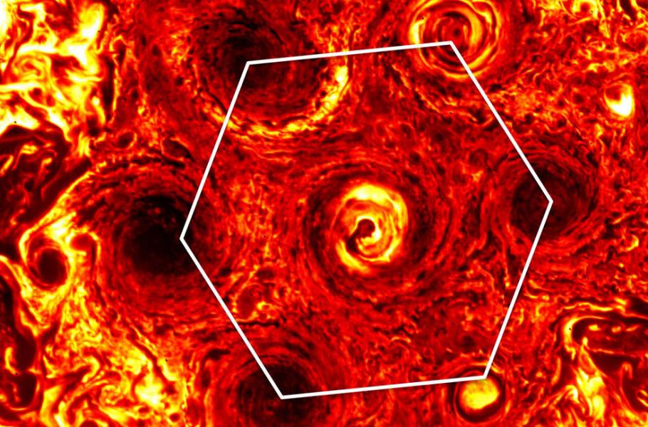 Na jižním pólu Jupiteru se nacházejí velmi pravidelně uspořádané gigantické cyklony. Donedávna tam pět takových cyklon, jejichž velikost se blíží pozemským kontinentům, vytvářelo tvar pětiúhelníku, se šestou cyklonou uprostřed. Na nových snímcích sondy Juno se ale objevila další cyklona, která doplnila šestý vrchol obrazce na jižním pólu Jupiteru, takže tam vznikl šestiúhelník.