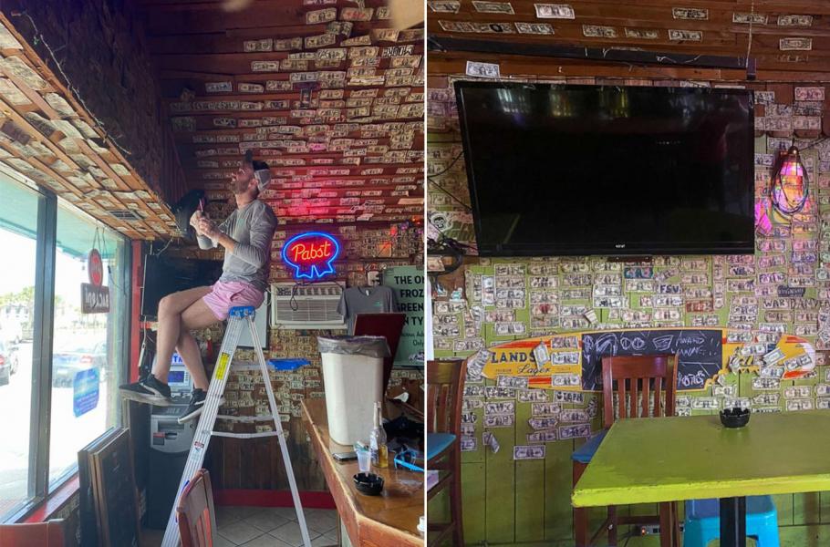 Sand Bar v americkém městě Tybee Island musel kvůli vlně koronaviru zavřít a stejně jako mnoho dalších podniků se ocitl ve finanční tísni. Během předchozích patnácti let provozu však měli jeho zákazníci ve zvyku „po sobě“ zanechávat bankovky přišpendlené na stěny či strop. Někteří na ně psali vzkazy, jiní je umisťovali na konkrétní místa jako své memento.