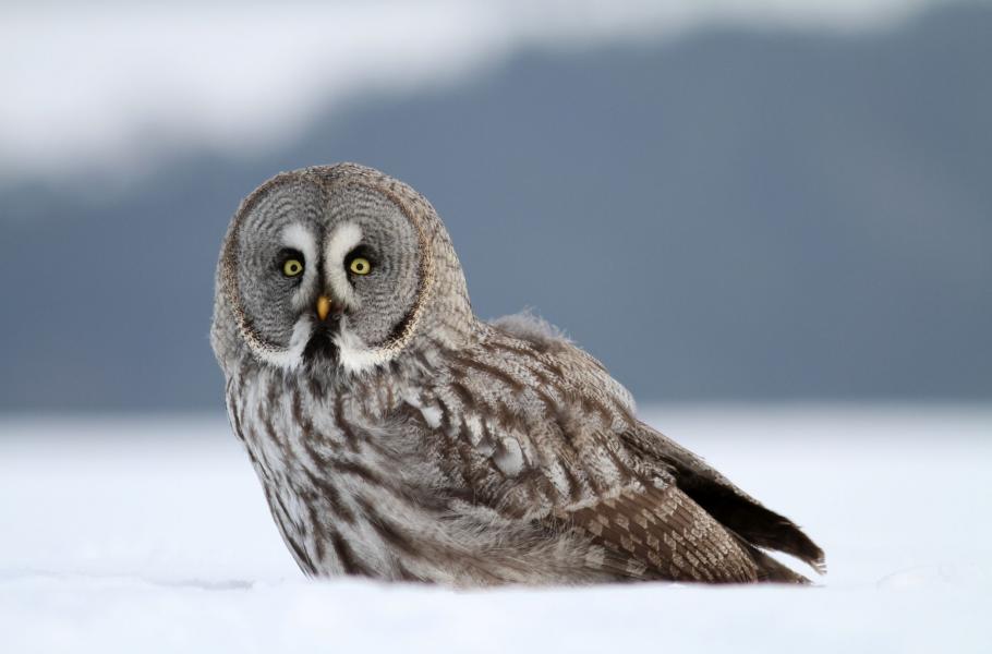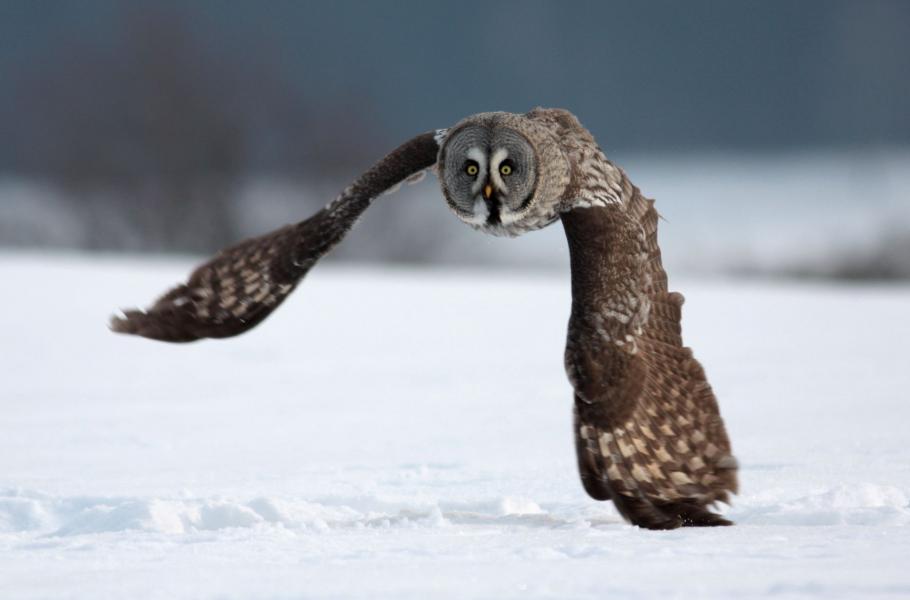 V mlčenlivé, bílo modré zimní krajině působí puštík vousatý jako vkusný doplněk. Aniž by narušil tichý řád, který v mrazivém dni vládne, roztáhne dlouhá křídla a neslyšně vzlétne