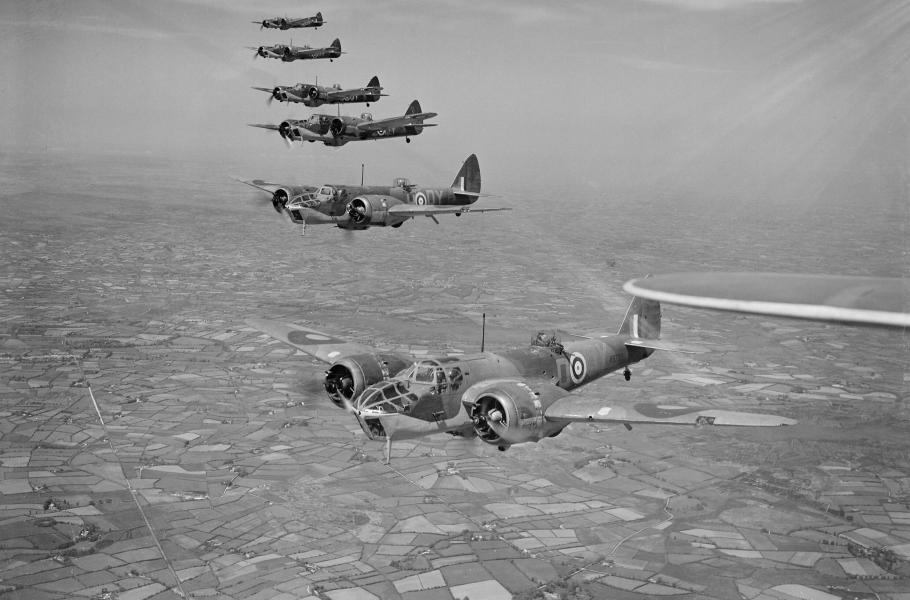 Formace Blenheimů Mk.IVF od 254. squadrony, která spadala pod Pobřežní velitelství a k jejímž úkolům patřilo hlídkování nad mořem. (foto: Wikimedia Commons, Imperial War Museums, IWM Non-Commercial Licence)
