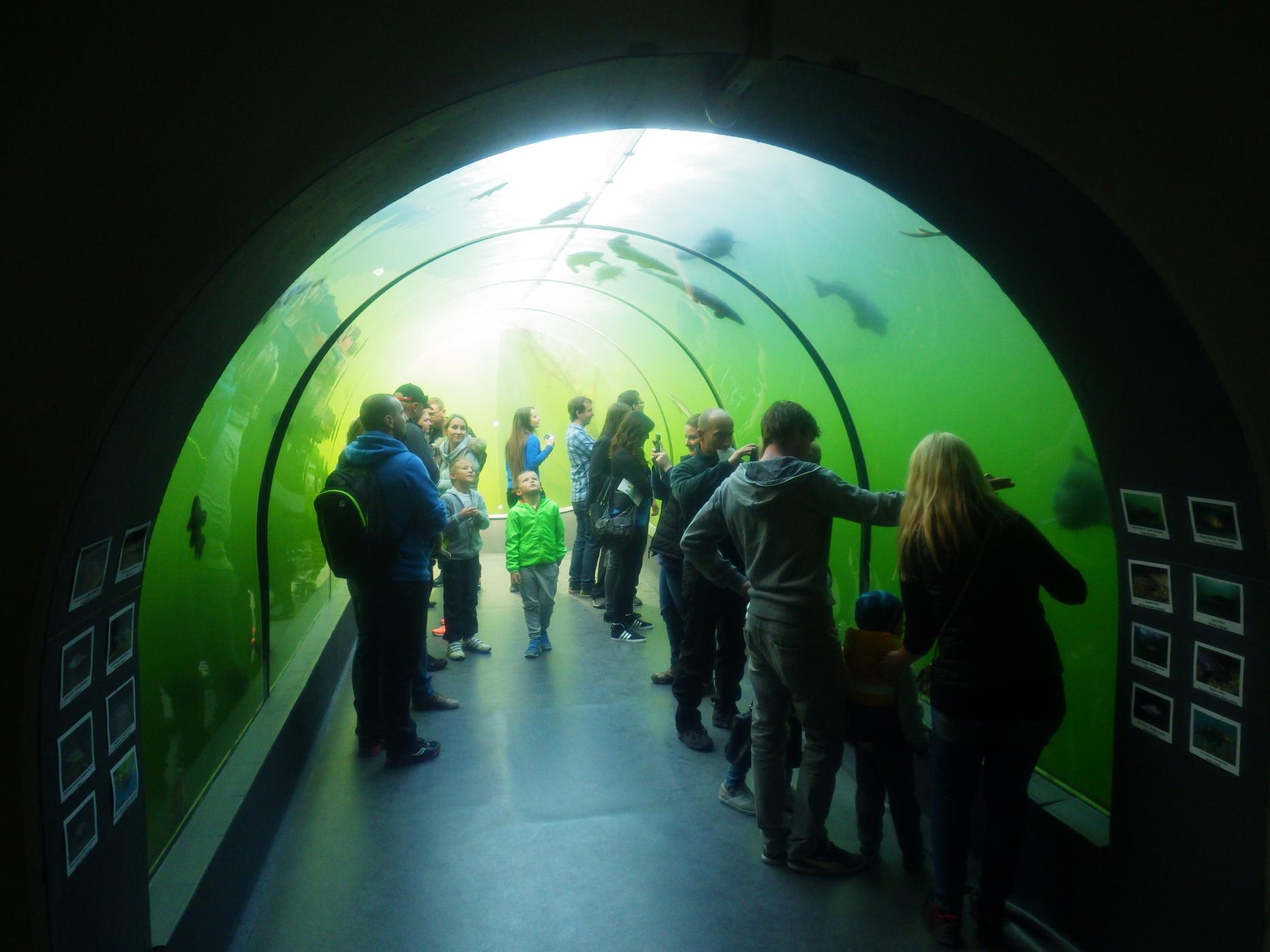 Podvodní tunel ve sladké vodě v přírodě je jedinečným experimentem v rámci celé Evropy. Je vybudován v hloubce tři a půl metru pod vodní hladinou rybníka, má délku osm metrů a na šířku měří dva metry. Na levé straně tunelu obdivují návštěvníci ryby chladných vod – horských potoků a bystřin (např. jelce, lipany, mníky, pstruhy, parmy či oukleje). Na pravé straně tunelu se objevují především velké ryby – štiky, candáti, sumci a největší rarity expozice – jeseteři ruští, malí a hvězdnatí a především největší sladkovodní ryby světa – vyzy velké. Tyto druhy jeseterů v minulosti migrovaly z Černého moře až do řeky Moravy.