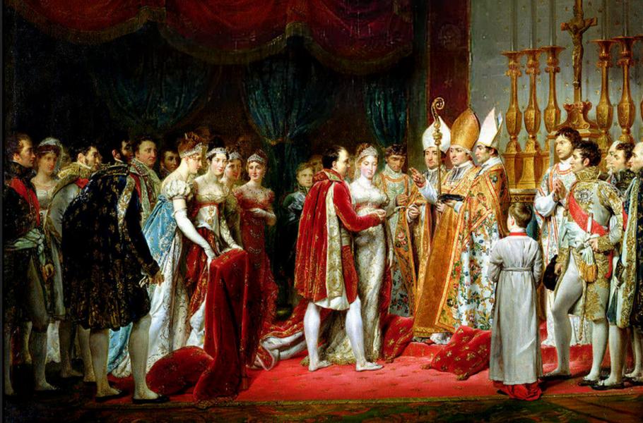 Sňatek Napoleona s Marií Luisou v Louvru, obraz francouzského malíře Georgese Rougeta. (zdroj: Wikimedia Commons, CC0)