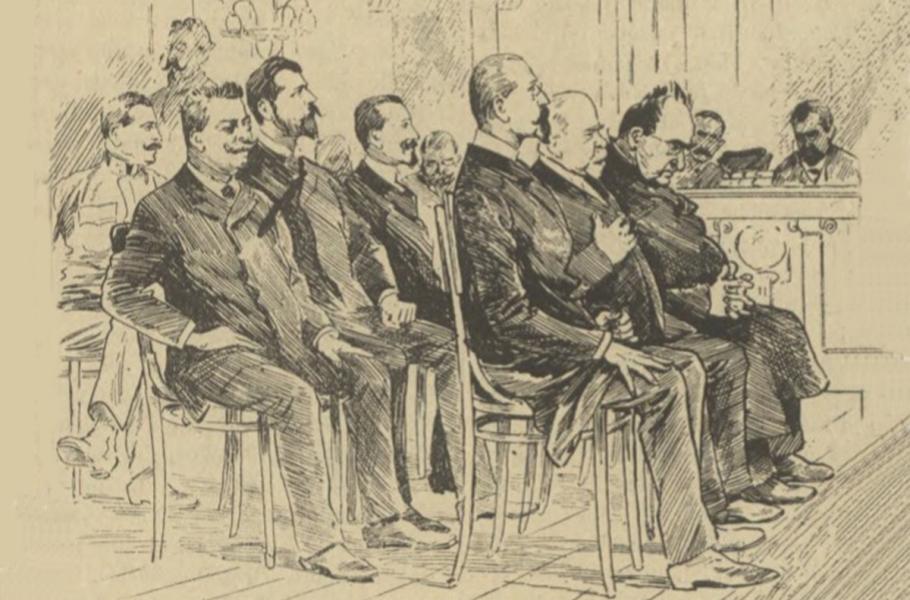 Obžalovaní funkcionáři před soudem. Zleva Bedřich Pekeländr, Emanuel Hercík, Bedřich Grünwald, Jindřich Bílý, Václav Kohout a Jan Drozd. (ilustrace: Wikimedia Commons, PDM 1.0)