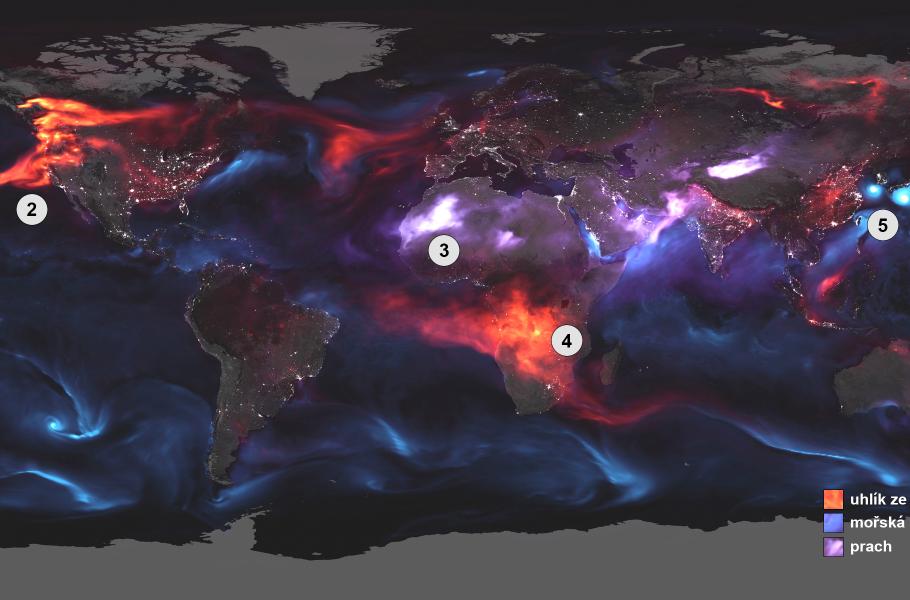 Pomocí dat z několika satelitů vytvořila NASA obraz naší planety tak, jak ji „zbarvují“ aerosoly. Snímek zachycuje rozlehlé lesní požáry, masivní cyklony i písečné bouře zuřící nad Saharou