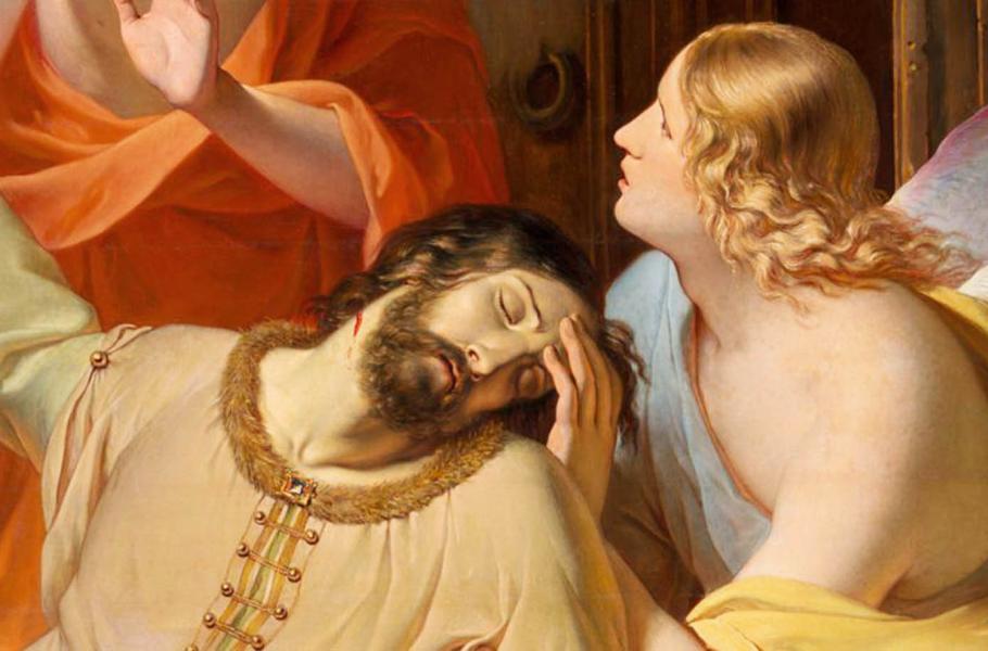 Svatý Václav – výřez z největšího obrazu s tematikou zavraždění knížete Václava. Plátno maloval vídeňský mistr Anton Petter původně pro oltář olomouckého dómu, 1844. (ilustrace: Wikimedia Commons, CC0)