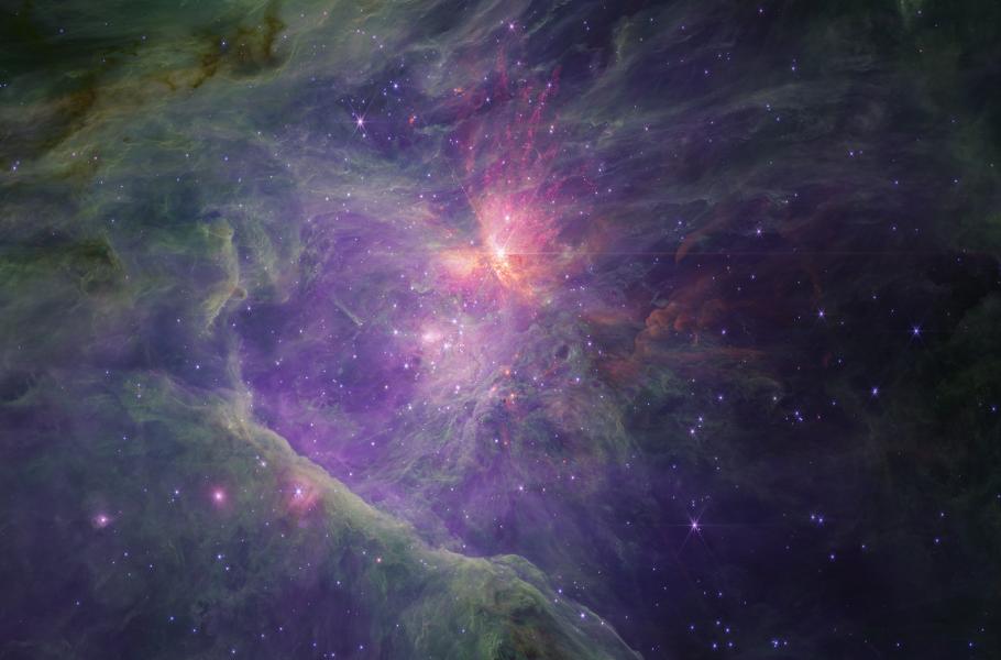 Mlhovina v Orionu infračerveným okem Webbova dalekohledu. (zdroj: NASA/ESA/CSA, Mark McCaughrean, Massimo Robberto, Kevin Luhman, Catarina Alves de Oliveira, CC BY-SA 4.0)