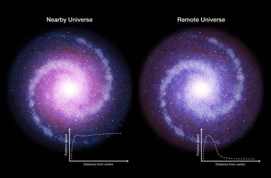 Výsledky pozorování vědce překvapily: Na rozdíl od spirálních galaxií v současném vesmíru rotují vnější okraje těchto vzdálených galaxií pomaleji než oblasti blíže středu, což by mohlo naznačovat, že je v nich přítomno méně temné hmoty.