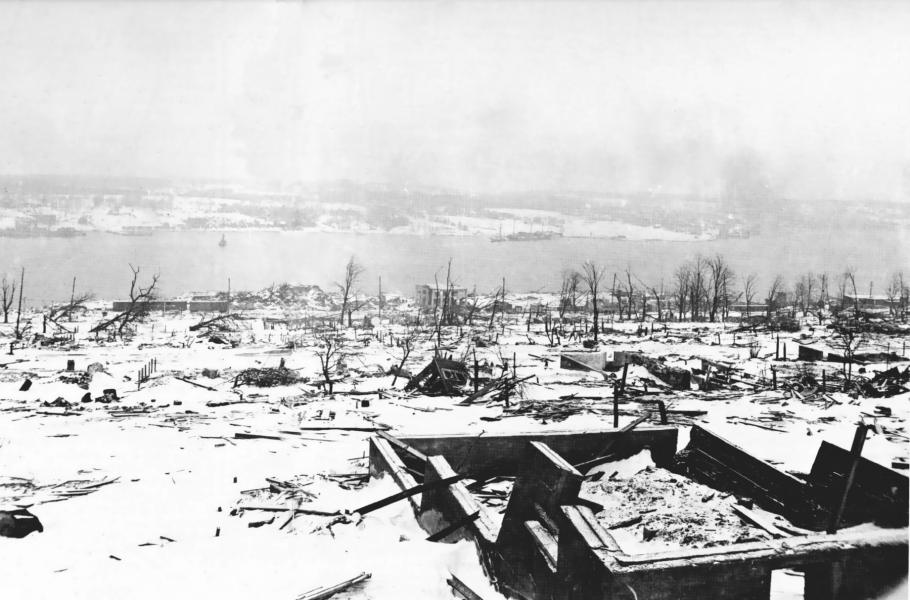 Zkáza, která zůstala na břehu po explozi munice na parníku Mont Blanc. (foto: Wikimedia Commons, William James, CC0)