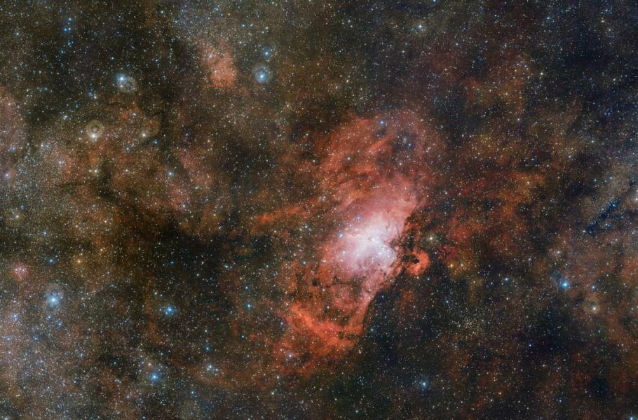Nový snímek, jehož originál má rozlišení přes tři gigapixely, zachycuje dvojici slavných mlhovin a jejich méně známého souseda na společném portrétu. Vpravo se nachází slabě zářící oblak plynu s označením Sharpless 2-54, uprostřed leží ikonická Orlí mlhovina a vlevo mlhovina Omega. Uvedená trojice objektů je však pouze malou částí rozsáhlého komplexu oblaků plynu a prachu v této oblasti, ve kterých se k životu probouzejí nové hvězdy a ozařují své okolí.