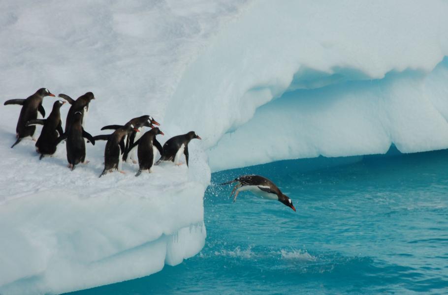Skok z ledu do vody vyžaduje zase odhodlání jiného druhu. Tučňáci totiž dobře vědí, že pod hladinou se může skrývat jejich obávaný nepřítel tuleň leopardí. Skok do ledové vody může být tím pádem posledním „letem“ tučňáčího života.