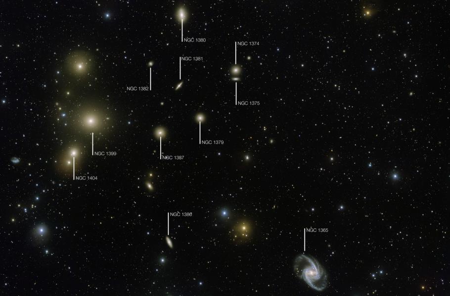 V dolní části snímku se nachází velká spirální galaxie s příčkou NGC 1365, která je klasickým příkladem tohoto typu galaxií – nápadná příčka prochází centrální částí galaxie a spirální ramena vycházejí z konců této příčky. A jak už to bývá u galaxií v kupě, i v případě NGC 1365 najdeme něco, co není patrné na první pohled. NGC 1365 je klasifikována jako Seyfertova Galaxie – má jasné aktivní jádro, v jehož středu se ukrývá superhmotná černá díra.