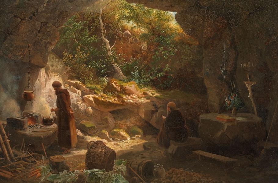 Aby podpořili pokojnou atmosféru parku v anglickém stylu, začali si zámožní lidé v 18. století k pobytu najímat skutečné poustevníky. (ilustrace: Wikimedia Commons, PDM 1.0)