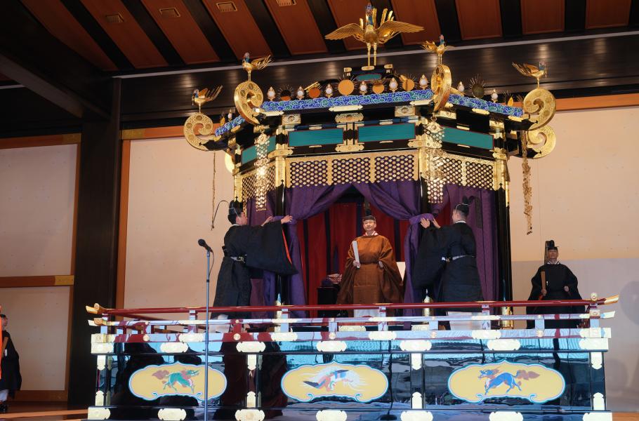 Nezbytnou součást korunovace, jež naopak podporu v ústavě nadále má, tvoří také převzetí kamenného zrcadla, klenotů a meče – tedy trojice posvátných císařských symbolů, pocházejících podle tradice přímo od bohyně slunce.