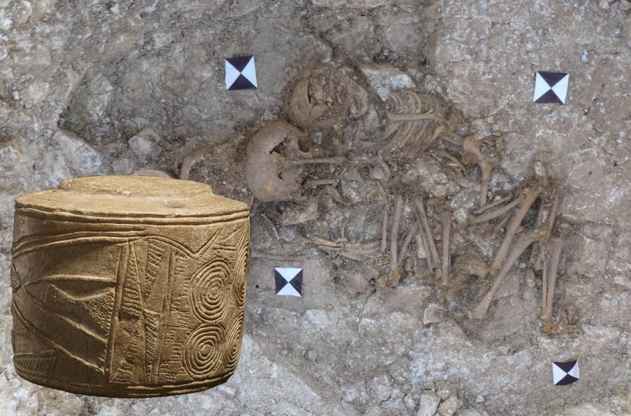 U hlavy nejstaršího z dětí byla pohřbena pozoruhodná křídová skulptura ve tvaru válce, kterou pokrývají abstraktní motivy, s nimiž si archeologové příliš nevědí rady. Součástí pohřbu byl i velký kostěný špendlík a míček, rovněž vyrobený z křídy.