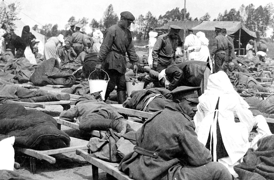 Příslušníci ruského Červeného kříže pečují o carské vojáky zasažené otravným plynem. (foto: Wikimedia Commons, Bisbee Daily Review, PDM 1.0)