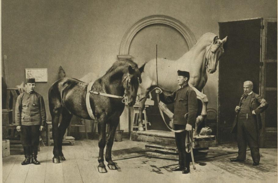 Myslbek při modelování koně sv. Václava. (foto: Wikimedia Commons, PDM 1.0)