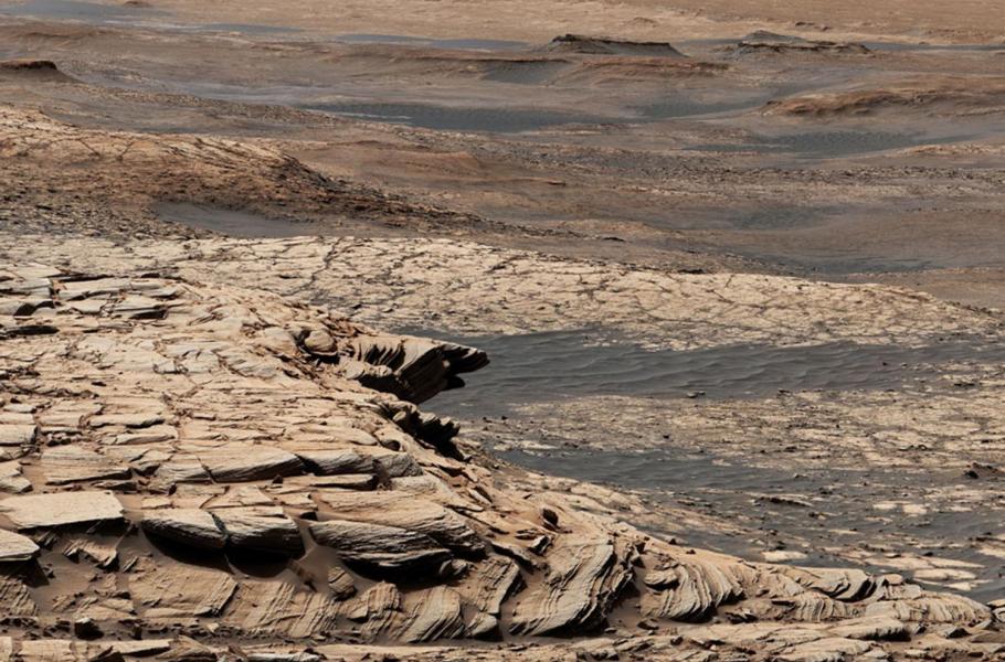 Krajina rudé planety, jak ji zachytil rover Curiosity. V pozadí se nachází dno kráteru Gale. Pode vědců se zde před 3,5 miliardami let rozkládal mohutný oceán. (foto: NASA/JPL-Caltech/MSSS, CC BY-SA 4.0)