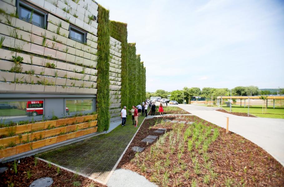 Vertikální louka na výrobní hale slouží jako přírodní klimatizace