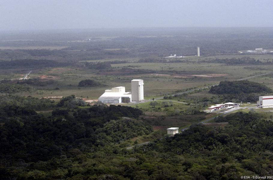 Panoráma infrastruktury na evropském kosmodromu Kourou vytváří vcelku dobrou představu o povaze tamní krajiny. V popředí montážní hala pro kompletaci raket
