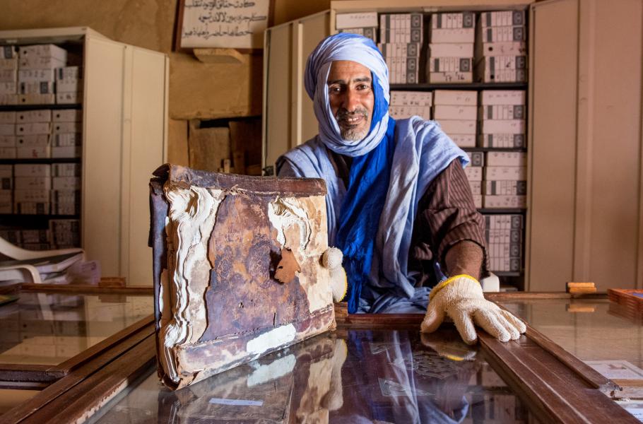 Prohlídku zajišťuje knihovník, který v útrobách svého království strávil celý život a pro nějž starost o knihy znamená poslání. Mluví „jen“ francouzsky a arabsky, stejně jako lidé téměř v celém regionu. I s těmi několika anglickými slovy, jež zná, se však pokouší o výklad. Nejprve ukazuje nejstarší tištěnou knihu, kterou vlastní. Než ji uchopí, navléká si rukavice, pak ji přenese na pultík a velice opatrně otevře. Svazek ze 13. století obsahuje náboženské texty.