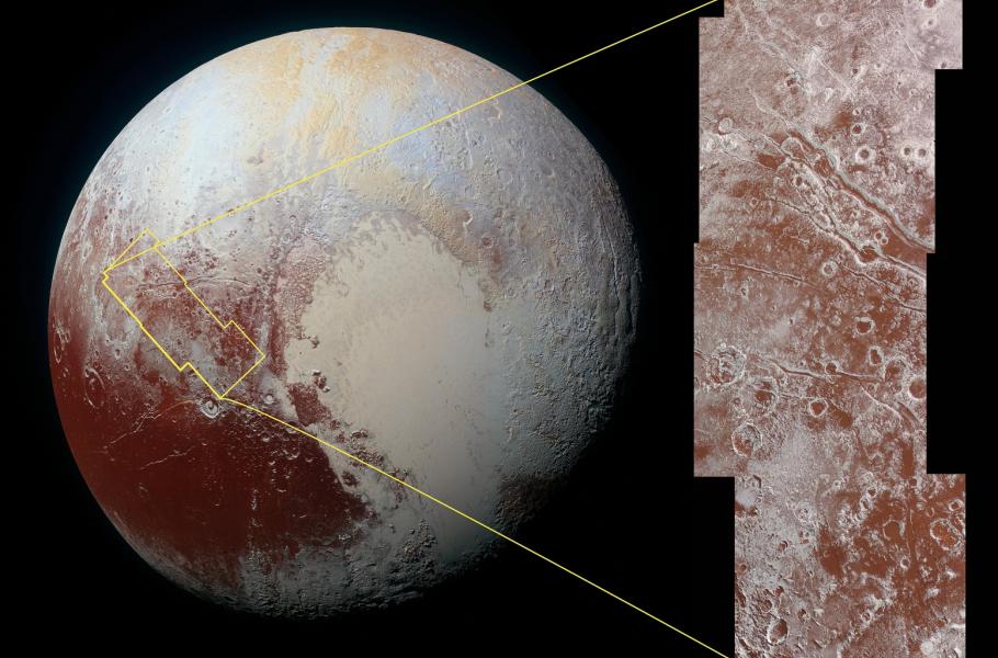 Nový snímek Pluta odhaluje pláně zmrzlého metanu a krátery s vrstvou tholinů v oblasti pojmenované Viking Terra. Červenohnědé tholiny představují skupinu heteropolymerních organických sloučenin, vznikajících při ozařování směsi dusíku a jednoduchých organických sloučenin (methanu, ethanu atp.) slunečním ultrafialovým zářením. Na Zemi tyto sloučeniny neznáme, o to častěji jsou ale k vidění ve vzdálených světech Pluta nebo na Saturnově měsíci Titanu.