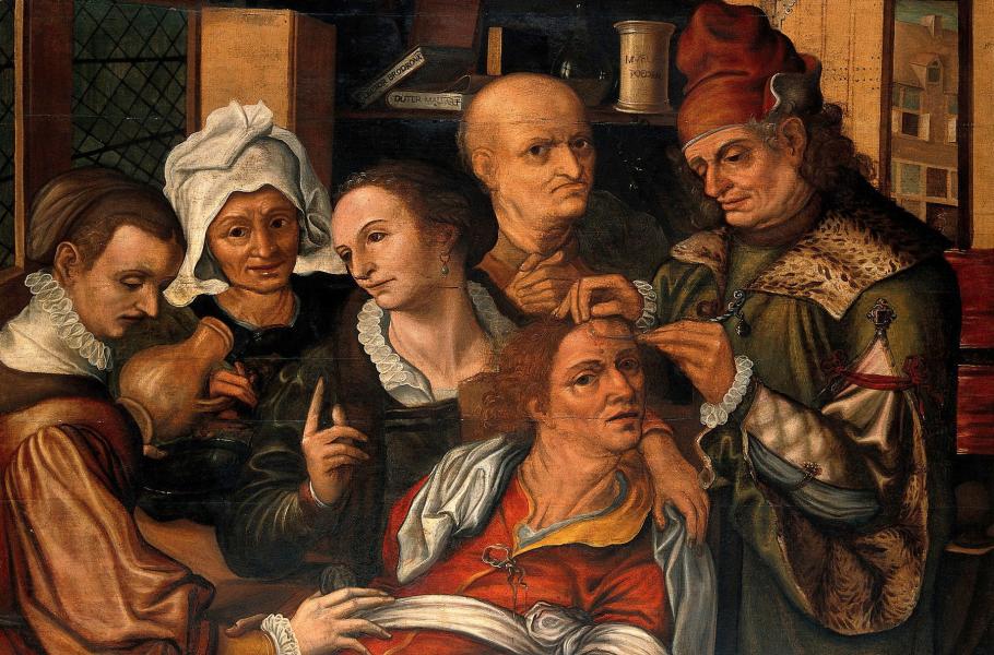 Chirurg provádí svému pacientovi trepanaci lebky, olej holandského malíře Pietera Huyse z poloviny 16. století. (ilustrace: Wikimedia Commons, Wellcome Images, CC BY 4.0)