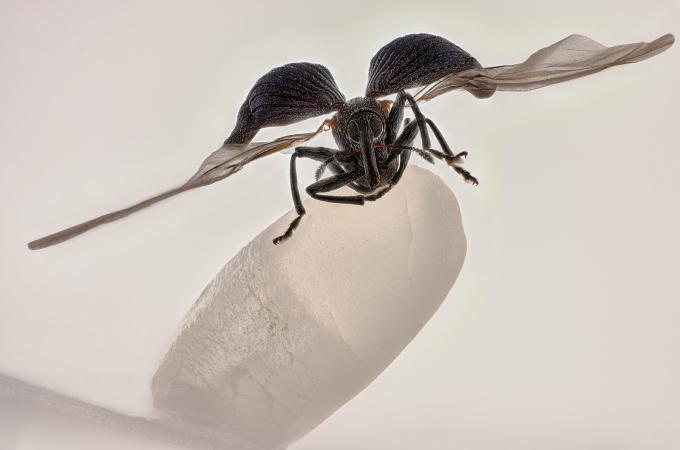 Po oplodnění kladou samičky vajíčka do okvětních hlávek krvavce totenu (cca po pěti vajíčkách do jedné hlávky), přičemž preferují starší a vyšší květní hlávky. Mezi vědci je diskutována otázka, zda samičky dávají přednost rostlinám v těsné blízkosti mravenišť. Terénní pozorování tomu nenasvědčují.