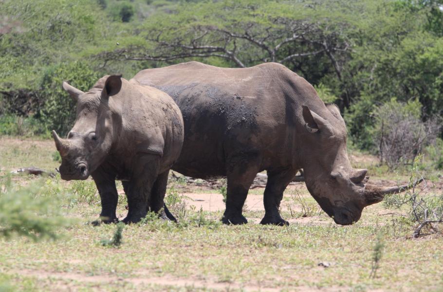 Narazit tady na bílé nosorožce, které studuje právě Marneweck, není vůbec vzácné. V parku jich podle odhadů žije přes 1 500. Když je velké sucho, potkáte nezřídka i osmi- nebo vícečlenné skupinky u bahnišť, jak pokojně odpočívají ve stínu akácií a křovisek. Nechybí ani partičky dorůstajících puberťáků, kteří jsou už příliš velcí na to, aby se drželi matky, ale osamělý život je zatím neláká. Při větší dávce štěstí narazíte i na vzácnější a plašší nosorožce dvourohé (Diceros bicornis). Zkrátka na první pohled ráj nosorožců.