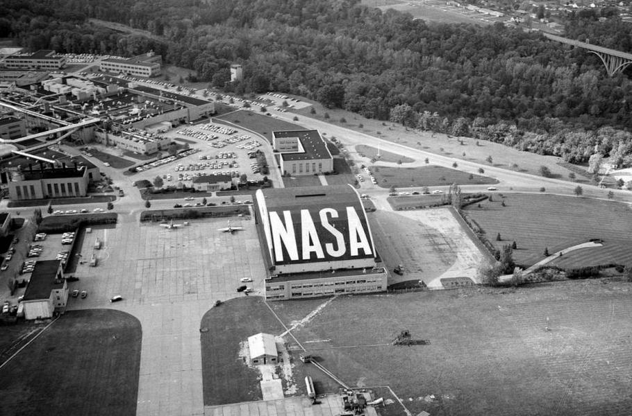 Střecha budovy Flight Research Building s nápisem odrážejícím přerod NACA v NASA, říjen 1958. (foto: NASA, CC0)