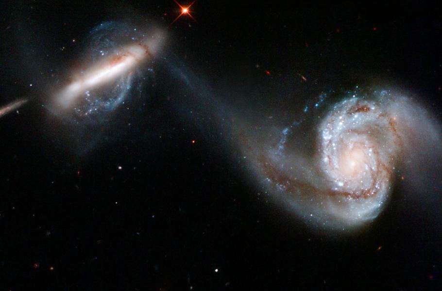 Arp 87 ze souhvězdí Lva představuje typickou dvojici interagujících galaxií (NGC 3808A a NGC 3808B), kde dochází k přenosu mezigalaktického plynu. (foto: NASA, ESA, Hubble, CC BY-SA 4.0)