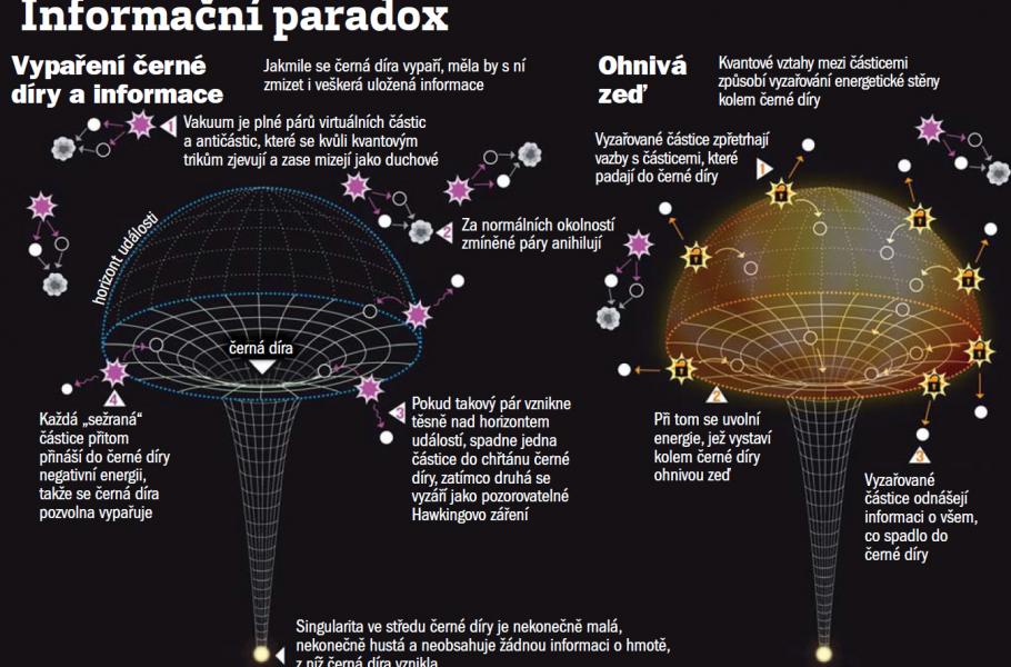 Vášně kolem informačního paradoxu černých děr časem vychladly. Nedávno se však objevil jeho mutant, zákeřný a nakažlivý jako ptačí chřipka. Podle Josepha Polchinského z Kalifornské univerzity v Santa Barbaře vytvářejí fotony Hawkingova záření, jež opouští černou díru, na horizontu událostí přízračnou stěnu energie. A ta by sežehla všechno, co k ní dorazí. S tím nicméně zase bojuje obecná relativita, pro kterou je průchod horizontem událostí, padá-li něco do černé díry, vcelku nudný. Pokud byste se ocitli na horizontu událostí, jednoduše spadnete do černé díry a ničeho si nevšimnete – jen toho, že vás roztrhají slapové síly.