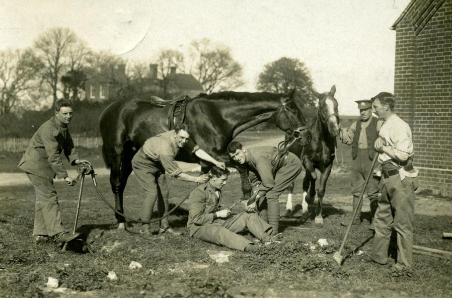 Státy Dohody spoléhaly na dodávky tažných zvířat ze Spojených států. Zde péče o zvířata v podání britských vojáků. (foto: Wikimedia Commons, Fred C. Palmer, PDM 1.0)