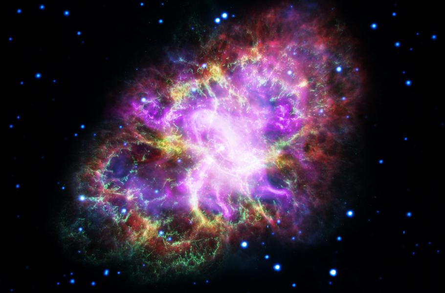 Nejnovější pohled na Krabí mlhovinu vznikl díky pozorování čtyř vesmírných přístrojů a pozemského radioteleskopu. Data z družice Chandra (rentgenově), XMM-Newton (ultrafialově), Hubble (viditelně) a Spitzer (infračerveně) jsou vidět fialově, modře, zeleně a žlutě. Pozemská data na rádiových vlnách z VLA (Very Large Array) jsou vidět červeně.