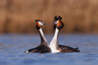 Když je mírná zima, můžete už koncem února a především v březnu sledovat na hladinách rybníků nádherné rituální tance potápek roháčů (Podiceps cristatus).