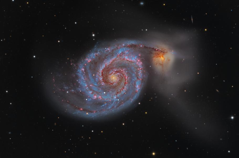 Vírová galaxie, nebo též M51, je spirální galaxie v souhvězdí Honicích psů, která je od nás vzdálená asi 23 milionů světelných let. Velmi blízko ní se nachází trpasličí galaxie NGC 5195, která kolem své větší sousedky krouží, a vždy jednou za pár set milionů let projde jejím diskem. Nebude to ale trvat věčně, Vírová galaxie postupně trpasličí galaxii pohltí.