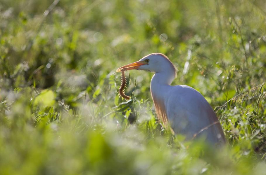 Nad našimi hlavami přelétá hejno smaragdových alexandrů malých (Psittacula krameri). Křik papoušků se prolíná s halekáním pastevce shánějícího stádo ovcí, které doprovází množství volavek rusohlavých (Bubulcus ibis). Elegantní bělostní ptáci s okrově žlutým peřím v zátylku, na prsou a na zádech loví hmyz vyrušený pohybujícím se stádem. Některé volavky svou kořist vyhlíží přímo z chundelatých hřbetů, což je pro tento ptačí druh typické (v Africe takto využívají stáda velkých kopytníků). Taktika „lovu z pozorovatelny“ je úspěšná, a tak v zlatavém protisvětle zvěčňuji volavku, která se zmocnila pěkně dlouhé mnohonožky.