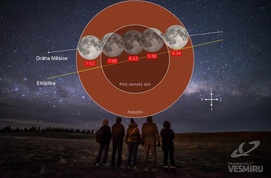 Nepotrvá však dlouho, a přidají se i další, méně jasné hvězdy. Měsíc totiž postupně zeslábne s tím, jak se jeho zářící povrch ponoří do stínu Země. Ten se poprvé objeví ve 4:34 SEČ při levém horním okraji měsíčního kotouče, kdy započne tzv. částečné zatmění. V následující hodině bude stín postupovat k protilehlému pravému dolnímu okraji a poslední cíp nezastíněného měsíčního povrchu spatříte v 5:41 SEČ. V tom okamžiku vstoupí zatmění do úplné fáze, přičemž jeho střed nastane v 6:12 SEČ. Nedaleko zatmělého Měsíce pak můžete zkusit vyhledat velkou otevřenou hvězdokupu Jesličky (M44) v souhvězdí Raka: Stačí se vydat do úhlové vzdálenosti 7° na západ od červenohnědého měsíčního kotouče.