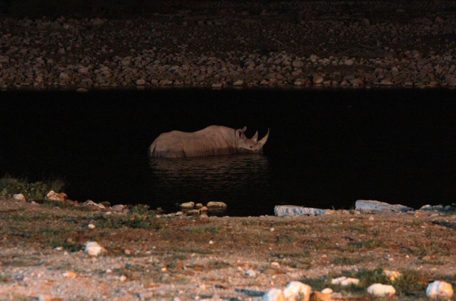 Po dvou hodinách na lůžku jsem v pět ráno zase na místě. Napajedlo vypadá opuštěně, jen vytrvalý nosorožec se pořád promenáduje kolem. Vstát před východem se ale vyplatilo, nosorožec dělá vše možné, aby se mi za ranní vstávání odvděčil. Najednou otáčí hlavu k vodě a pomalu nakráčí doprostřed napajedla, kde zůstává stát. Přechází z jedné strany na druhou. Voda mu sahá až do půli břicha a když vyjde na mělčinu, je dvoubarevný. Svrchní polovina světlá, ta spodní tmavá.