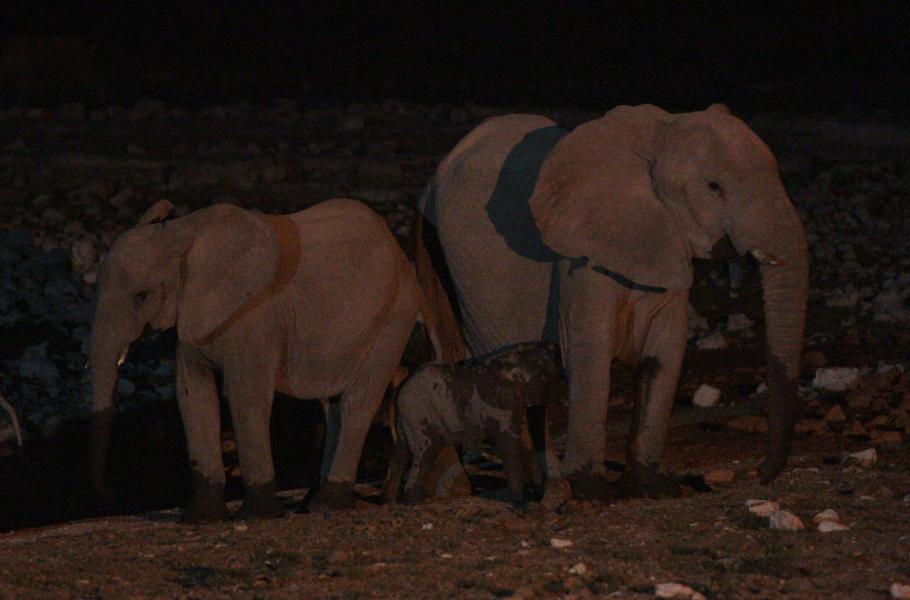 Nosorožec najednou zvedá hlavu a rychle se vzdaluje od vody. Od východu, zpoza rozložité akácie, přichází skupina slonů (Loxodonta africana) – rodinka na cestě za vodou. Blíží se překvapivě tiše a opravdu svižně. Zřejmě je žene žízeň. Vůdčí samice rychlým pohledem zhodnotí situaci a pak se předníma nohama postaví do vody. Ostatní, včetně malých slůňat udělají totéž. Je slyšet, jak nasávají vodu do chobotů a pijí. Nocí se rozléhá i jejich hluboké mručení. Tato výjimečná chvilka je překvapivě krátká. Uběhly snad jen tři minuty a vůdčí slonice se otáčí k odchodu. Všichni ostatní ji následují stejně svižným krokem, jakým přišli. Teprve když zmizí ve tmě za akácií, uvědomuji si, že všichni lidé, kteří jejich noční zastavení pozorovali, byli tiší jako pěny. Ani hlásek, ani šeptnutí.