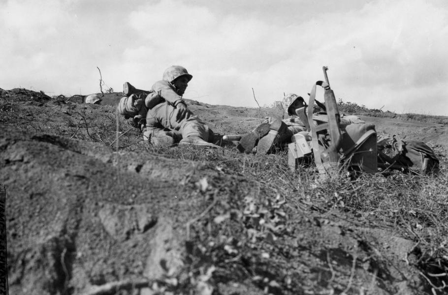 Mariňáci během bitvy o Iwodžimu. Zdejší letiště mělo sloužit jako letecká základna pro útok na hlavní japonské ostrovy. (foto: Flickr, Signal Corps Archive, PDM 1.0)