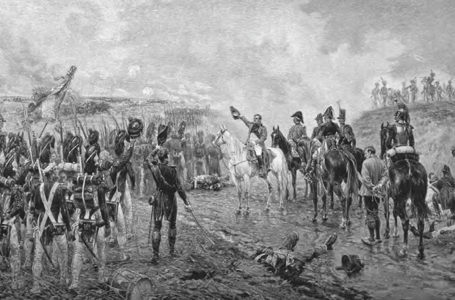 Napoleonův poslední velký útok u Waterloo. Francouzský císař povzbuzuje vojáky staré gardy před jejich útokem. (ilustrace: Wikimedia Commons, Ernest Crofts, PDM 1.0)