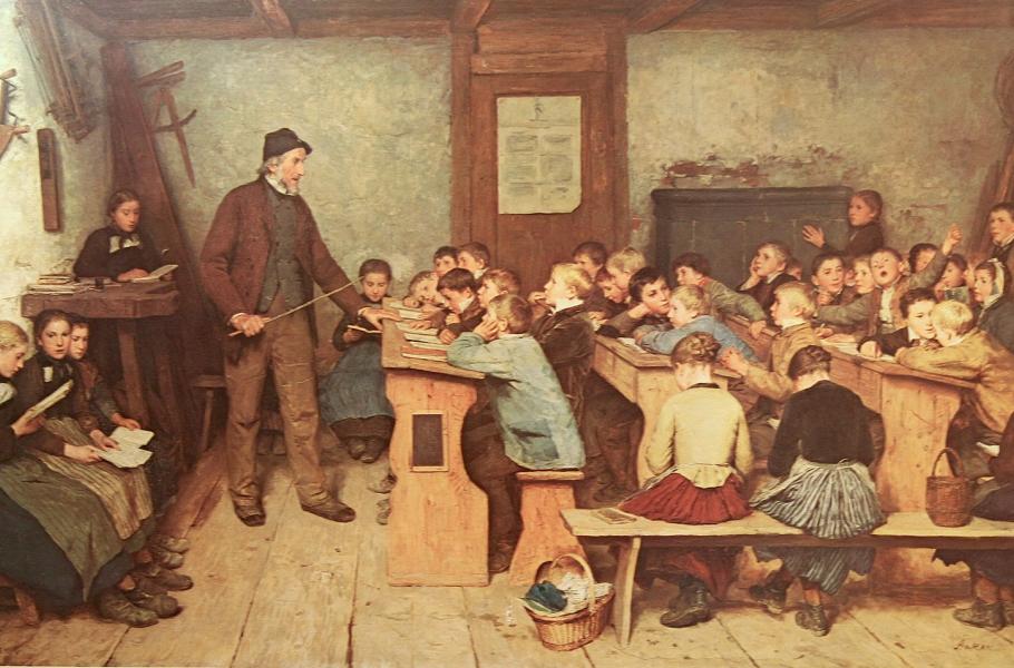 Rozdíl mezi špičkovými domácími pedagogy a zapadlými venkovskými učiteli byl propastný. (ilustrace: Wikimedia Commons, Albert Anker, CC0)