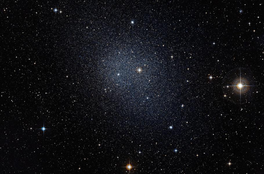 Jednou ze satelitních trpasličích galaxií Mléčné dráhy je galaxie Pec, nacházející se ve stejnojmenném souhvězdí. (foto: Wikimedia Commons, ESO/Digitized Sky Survey 2, CC BY-SA 4.0)